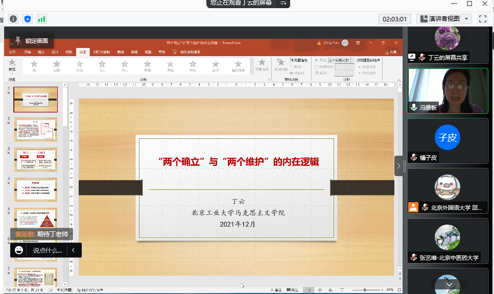 北京工业大学伟德国际英国副院长丁云教授以“‘两个确立’与‘两个维护’的内在逻辑”为题做了主题报告。她从马克思主义政党建设中的权威理论出发,阐释权威存在的必然性及其表现形式,并结合中国共产党百年历史和党的领导核心形成的经验与中华民族伟大复兴的必然要求,从理论、历史与现实三个方面论述了“两个确立”与“两个维护”的内在逻辑。她强调,理解与把握“两个确立”与“两个维护”的内在逻辑,是深入理解“两个确立”,坚决做到“两个维护”的前提与基础。