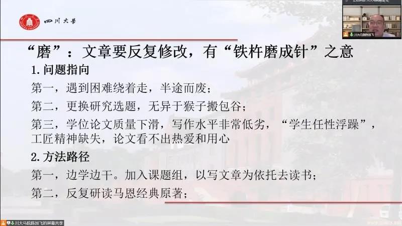 陈加飞老师以自身的经历为例,为同学们的研究和学习提供了许多经验和建议。他认为,作为一个马克思主义理论的研究生,我们应该读六类书:经典原著、重要文献、学术专著、权威教材、权威期刊、人物传记;弘扬五种精神:战士精神、啄木鸟精神、工匠精神、批判精神、愚公移山精神。同时,陈加飞老师希望同学们要坚持马克思主义的价值追求,为劳动人民发声,为人的自由而全面的发展思考。以阅读原著为切入点,勤学善思,苦练基本功,成为一个有着坚定政治立场和深厚学术功底的马克思主义理论研究生。