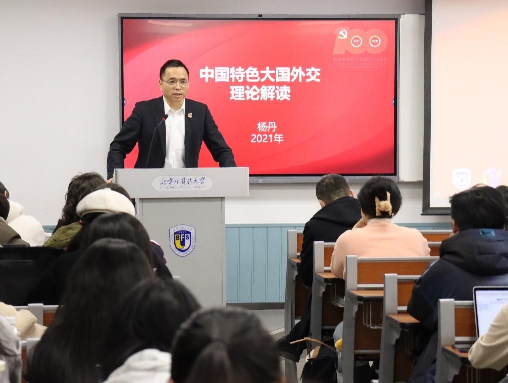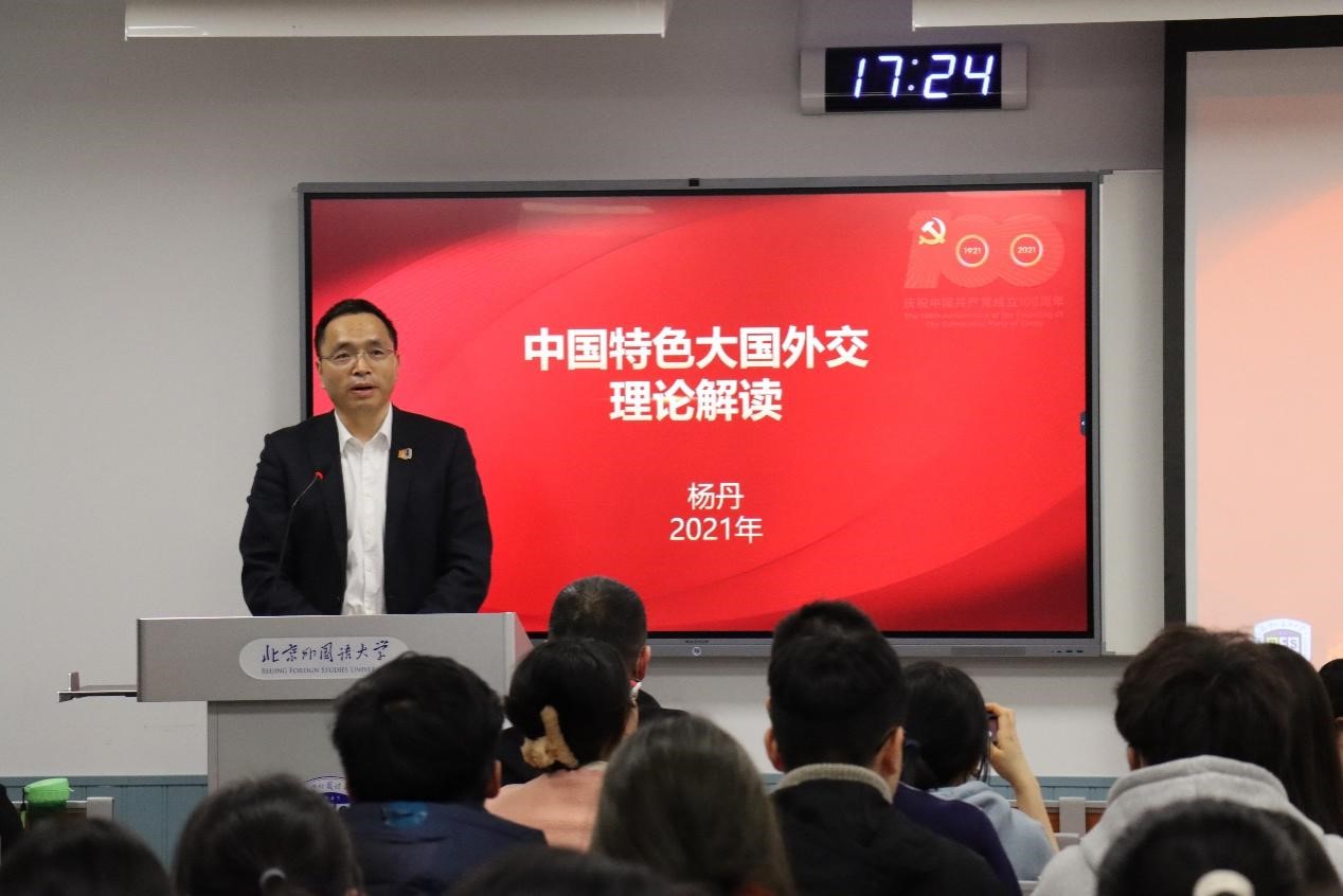 杨丹校长分别从“百年未有之大变局下的‘中国’”、“人类命运共同体愿景的‘特色’”、“参与塑造全球新秩序的‘大国’”、“全方位展现中国智慧的‘外交’”、“中国之‘北外’,世界之‘北外’”五个方面,对“中国特色大国外交的理论解读和北外实践”进行了全面分析和系统阐述。