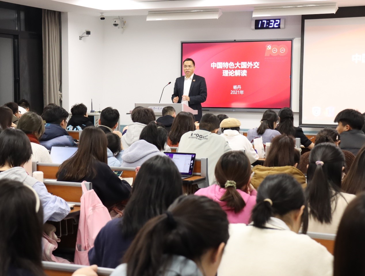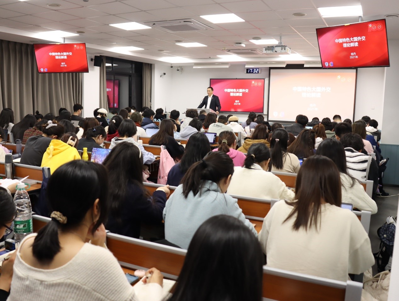 12月8日,伟德国际英国校长、党委副书记杨丹教授在逸夫楼为国际商学院2021级本科生讲授了题为《中国特色大国外交的理论解读》的形势与政策专题课。