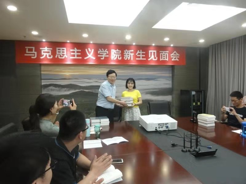 会议最后进行了隆重的赠书活动。林建华院长向全体新生赠送了《马克思恩格斯选集》、《习近平谈治国理政》和《习近平新时代中国特色社会主义思想学习纲要》,鼓励大家读原著、学原文,悟原理。