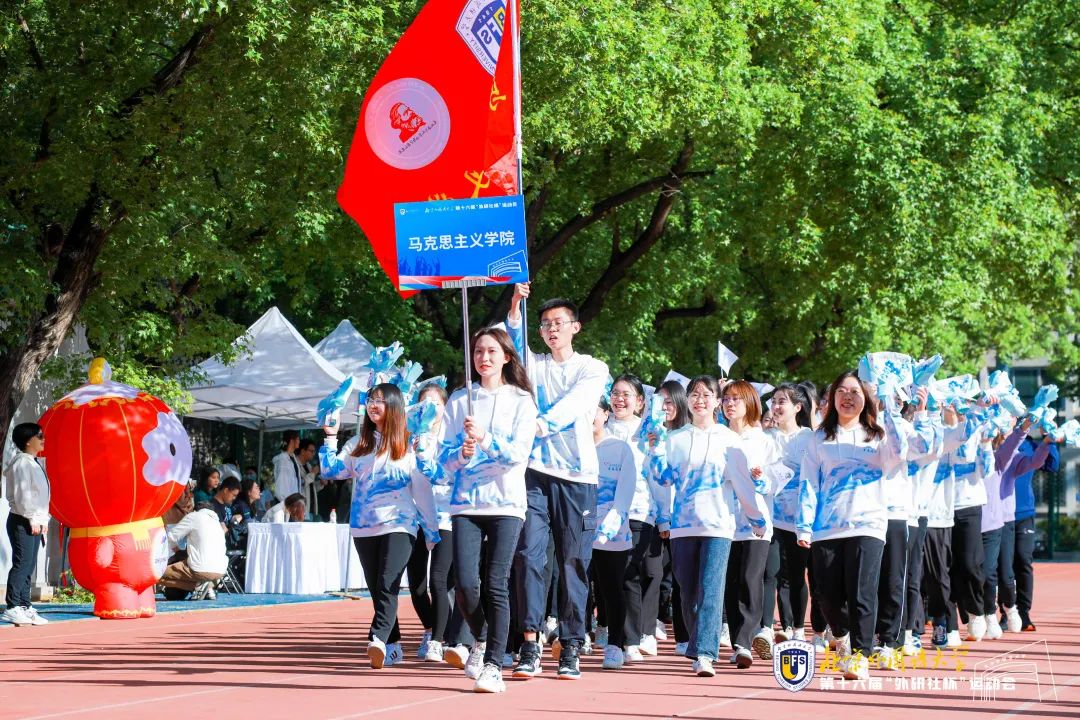红日东升,淡月西斜。一声号令齐列,阔步迎朝霞。四月中旬的北外校园,群芳斗艳,绿荫如洗,正是一年春好处。早上八时许,伴着雄壮的进行曲和会场播放的北外马院宣传片,在引导牌与院旗的带领下,伟德国际英国方阵昂首阔步走入运动场。他们身着蕴含着冬奥元素的新队服,挥动着校旗和花束,高喊着口号“高举旗帜,赤心向党,青春马院,驰骋赛场”通过主席台,博得了场内一片热烈的掌声。