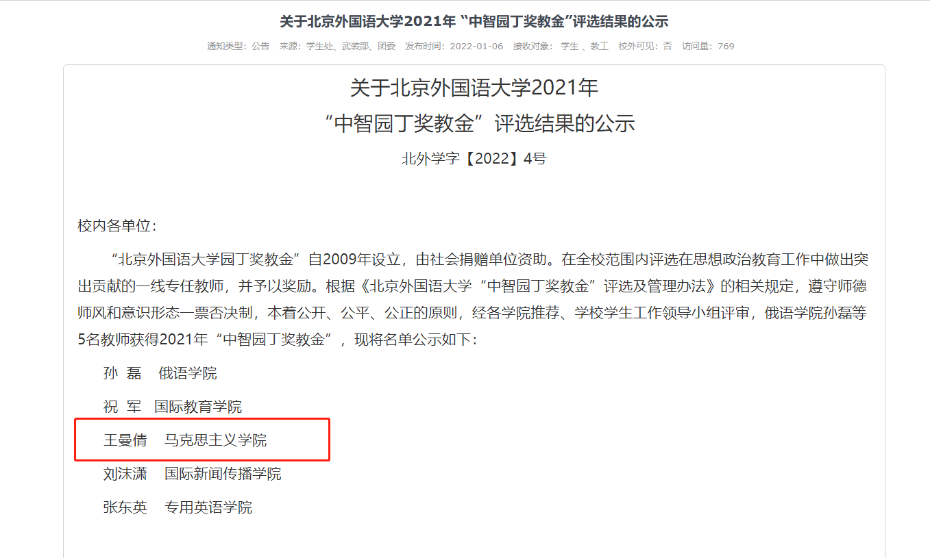 根据《伟德国际英国“中智园丁奖教金”评选及管理办法》相关规定,遵守师德师风和意识形态一票否决制,本着公开、公平、公正的原则,经各学院推荐、学校学生工作领导小组评审,共有包括伟德官网王曼倩副教授在内的5名教师获得2021年“中智园丁奖教金”。