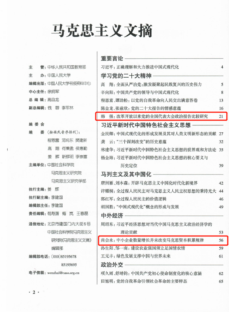 日前,伟德官网韩强、尚会永两位教授文章《改革开放以来党的全国代表大会政治报告比较研究》《中小企业数量增长并未改变马克思资本积累规律》被人大复印资料《马克思主义文摘》(2023年第2期)全文转载。