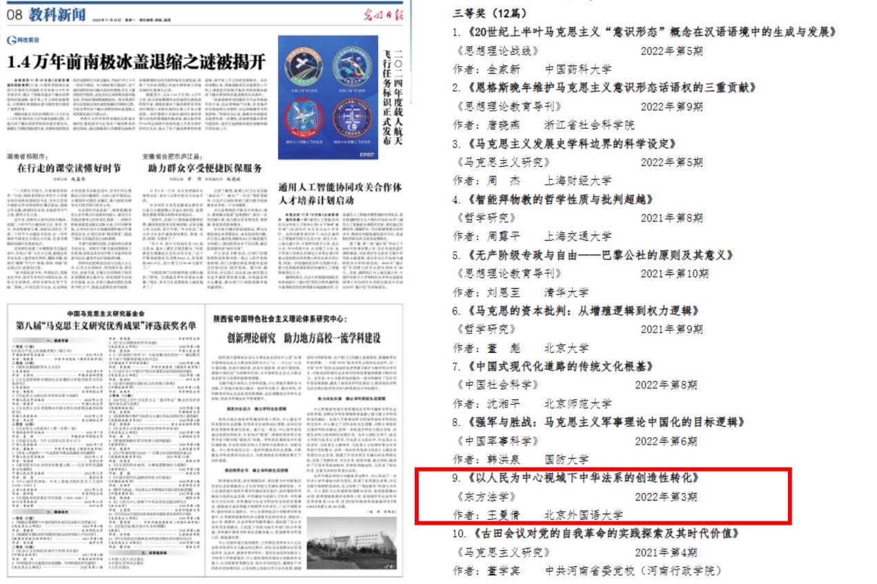 近日,中国马克思主义研究基金会公布了“第八届马克思主义研究优秀成果奖”获奖名单,全国共有20篇论文获奖,其中一等奖2篇、二等奖6篇,三等奖12篇。伟德官网伟德国际英国教师王曼倩的论文《以人民为中心视域下中华法系的创造性转化》获三等奖。
